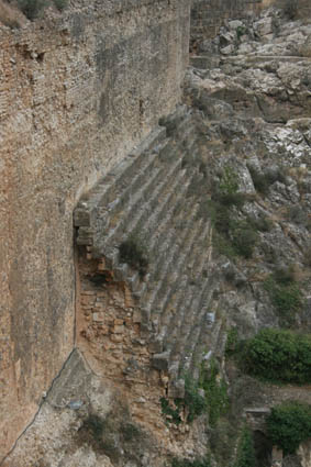 En una segunda reforma la presa se convirtió en presa de contrafuertes o espaldón doble (aguas arriba y abajo). Esta modificación se lleva a cabo en el siglo II d. C. (en época de Trajano o Adriano) y conllevó la elevación de la pantalla y de la cota de servicio de agua desde los aliviadores superiores en 1,80 metros; para ello se reforzó el grosor de la pantalla con un terraplén escalonado en opus caementicium aguas abajo, conservado en seis gradas, y un muro vertical de opus vittatum. Pronto, en ese mismo siglo, fue necesario construir para este muro un contrafuerte escalonado con grandes sillares de opus quadratum aguas abajo. Con esta modificación la presa presentaba básicamente el mismo aspecto tanto aguas arriba como aguas abajo. La situación de la presa en el barranco de escarpes rocosos obligó al planteamiento de una estructura de sistemas escalonados en opus quadratum. La acumulación de barros, sedimentos, limos, etc. colmató la presa aguas arriba, por lo que en el siglo III debió de dejar de ser usada. |
