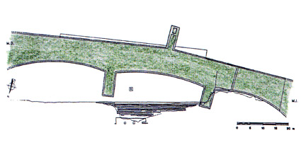 Planta de la presa en arcos de Almonacid de la Cuba, según Arenillas M. et alii, La presa de Almonacid de la Cuba. Del mundo romano a la ilustración en la cuenca del río Aguasvivas, Zaragoza, 1996 |