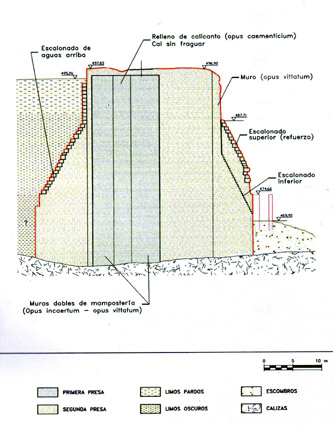 La presa debió de construirse en tres etapas, básicamente, hasta llegar a su forma definitiva. En un principio, la presa antigua sería una presa “de arcos”, construida en época de Tiberio (I siglo d. C.) con arcos y dos contrafuertes perpendiculares aguas abajo. El centro –o alma- de la presa se construye con opus caementicium –fuerte mortero u hormigón- y con opus incertum -piedras de tamaño pequeño e irregulares compactadas con mortero- recubierto de sillares de piedra en forma de paramentos con dos formas, opus vittatum –sillar pequeño o mampuesto escuadrado colocado en hiladas- u opus quadratum –piedras cortadas en forma de cubos o prismas cuadrangulares, en ocasiones almohadillados, es decir, con las aristas rebajadas, dando un bello efecto estético-. A esta primera fase corresponden dos tramos aguas arriba (con sistema de almohadillado de superficie plana) y la plataforma horizontal (el aliviadero superficial) aguas abajo. |