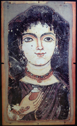 Reproducción fotográfica de un retrato en tabla del Egipto romano. Museo Provincial de Zaragoza. (Foto: Roberto Lérida Lafarga 03/01/2008) |