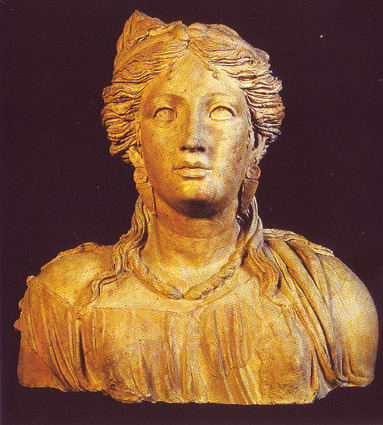 Busto de Ceres-Deméter procedente de Ariccia, datado a finales del siglo IV o primera mitad del siglo III a. C. Museo de las Termas, Roma; foto procedente de GABUCCI, Ada: Roma, Barcelona, 2006 |
