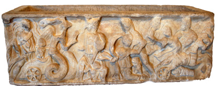 Sarcófago donde se representa, en el centro, el rapto de Perséfone por Hades. Museo Nacional de Arqueología de Tarragona. (Foto: Roberto Lérida Lafarga 06/06/2008) |