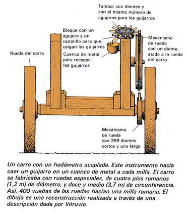 In the II century b. C., Caius Gracchus made a law about roads and he supervised the construction of some of them; the Romans said that this Roman politician took in charge to measure the roads in miles and to erect the miliaria. To measure them and to erect the miliaria it was invented a chariot with an instrument called hodometrus –from the Greek ὁδόμετρος “measurer of roads”- that left falling a little stone in a bowl every mile thanks to a mechanism of gears connected with the chariot wheels. |