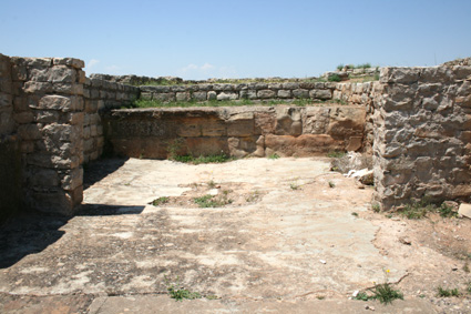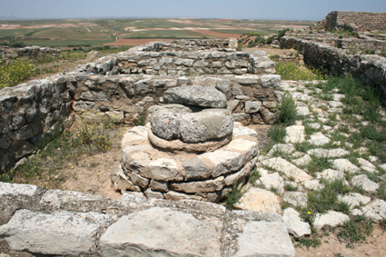 Calle de los vinicultores: al pie de la acrópolis se encuentra una calle a cuyos lados se encontraron doce estancias alargadas con pequeñas balsas de arcilla en su interior revestidas de yeso que debieron formar un pequeño barrio de productores de vino; en estas estancias se produciría y almacenaría el excedente de vino para su comercio; en algún caso las pequeñas balsas eran dobles y muestran distintas profundidades, lo que se interpreta como que algunas de ellas era donde se pisaba y fermentaba el vino, mientras que en las otras se trasvasaba el contenido a grandes tinajas o ánforas para su almacenamiento. |