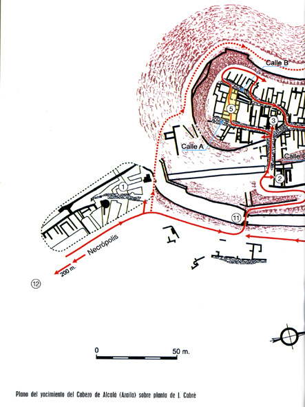 Sedeisken: El Cabezo de Alcalá en Azaila (Teruel) En el paraje de la Dehesa de los Pedreñales, apenas a 1,5 kms de Azaila (Teruel) se encuentra el Cabezo de Alcalá, una loma de 323 m sobre el nivel del mar, 83 m sobre la terraza del río Aguasvivas y 33 m sobre los llanos que rodean parcialmente el Cabezo. El Cabezo es un gran peñasco de base yesosa que ocupa una posición estratégica divisándose a 30 kms de distancia localidades como Belchite, Lécera e Híjar y antiguos poblados celtíberos como el del Cerro de la Bovina cerca de Vinaceite. Las excavaciones comenzaron en la última parte el siglo XIX, hacia 1885 por Pablo Gil y Gil y continuaron en la primera mitad del XX por el turolense Juan Cabré Aguiló desde 1919 a 1935 y de 1940 a 1942; sólo en la década de los 60 se retomaron los trabajos gracias a Antonio Beltrán y en 1976 por Miguel Beltrán. Fruto de todas estas excavaciones arqueológicas hemos llegado al conocimiento de esta ciudad sepultada. |