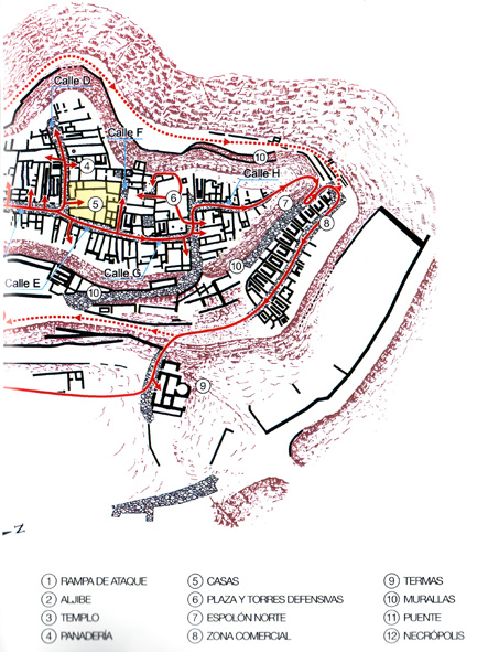 La acrópolis del Cabezo de Alcalá: La ciudad cuenta con unos ejes de 500 x 100 m respectivamente y se adapta perfectamente al terreno, al tiempo que la población también se adaptó al entorno del cerro. La ciudad se organiza entorno a un gran eje de norte a sur, calle principal de la que salen calles menores perpendiculares. La acrópolis está rodeada de una serie de murallas a distintas alturas a lo largo del cerro; en su lado este, donde la pendiente era bastante suave, la ciudad se protegió con un foso y un puente levadizo. En el espacio urbano dos grandes torres dominan la acrópolis. Dentro del poblado se pueden distinguir áreas dedicadas al culto religioso (un templo), áreas dedicadas al ocio (termas al estilo romano), zonas industriales y comerciales (al pie de la muralla en el lado noreste) y zona de viviendas (en el centro de la acrópolis). |