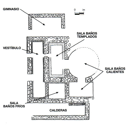 Las Termas: también al pie de la acrópolis se encuentran los restos de unas termas a los que se accedía desde una escalinata; su situación obedecía al hecho de que la cisterna de la que recibía el agua debía estar en una cota superior para asegura el suministro y la presión de agua necesaria para su funcionamiento; estas termas muestran también los elementos típicos de estos establecimientos: apodyterium, frigidarium, tepidarium y caldarium, así como posibles espacios exteriores dedicados a ejercicios gimnásticos.