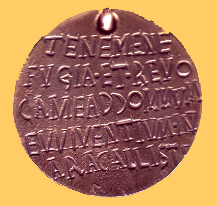 Copy of the medal of a collar belonging to an slave; we can read TENE ME NE FUGIA(M) ET REVOCAME AD DOM(I)NUM EVVIVENTIUM IN ARA CALLISTI ("Stop me in order that I don't run away and bring me to my owner, Euviventius, (who lives) in the temple of Callistus") (CIL XV 7193) |