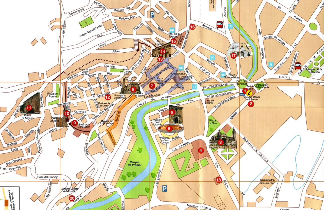 The city suffered a deep transformation along the I century b. C., it was finally settled in the left bank of the Queiles river. The city centre was in the modern Tudela street and its extension in the Rua alta de Bécquer, crossed by a perpendicular axe corresponding to the modern Carmen and Visconti streets; other modern streets like Madorrán, Quiñones and Cañuelo were plainly urbanized in this century. The upper side of the city was not urbanized then and probably kept out of the urban area; on the other hand, streets like Theather street or the Rudiana zone are the testimony of an industrial activity in that age. Once the Roman civil wars finished, the uptown was not inhabited, because it was neither comfortable nor practical, while the right bank of the river started to be inhabited, according to the remains found in some areas (Pradiel, Eguaras Palace, the Cathedral, Cinco Villas street, Borja street, the road to Saragossa, etc. So, the most ancient remains were found in the ancient road that connected Caesar Augusta and Asturica Augusta (nowadays Astorga, León). The cardo -main city from the north to the south- and the decumanus -main city from the east to the west- of the Roman city it is identified with San Atilano and San Bernardo streets, respectively. |