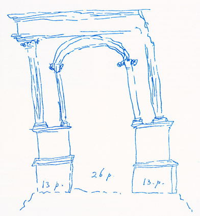 Arco honorífico de Tarraca, según boceto de Juan Bautista Labaña. (Fotografía procedente de ORTIZ PALOMAR, M.ª Esperanza y PAZ PERALTA, Juan Ángel: Los Bañales (Uncastillo), Los Atilios, La Sinagoga (Sádaba), Zaragoza, 2005) |