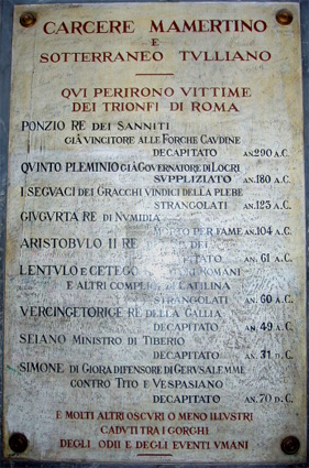Todavía un letrero nos anuncia donde se encuentran los restos de la cárcel Mamertina y el Tuliano y algunos de sus huéspedes más ilustres no cristianos. Entre ellos se leen reyes extranjeros como Yugurta rey de Numidia, Vercingetórix, rey de la Galia y Aristobulo II rey de Judea. (Foto: Roberto Lérida Lafarga 28/12/2004) |
