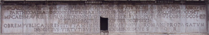Inscripción del Arco de Septimio Severo. En la primera línea se lee IMP. CAES. LVCIO SEPTIMIO M. FIL. SEVERO PERTICACI AUG PATRI PATRIAE PARTHICO ARABICO ET, es decir, "[Arco de triunfo dedicado] al Emperador César Lucio Septimio, hijo de Marco, Severo Pertinaz, Augusto, Padre de la Patria, Pártico, Arábigo y ...", donde al nombre del emperador, Lucio Septimio Severo Pertinaz, hijo de Marco, se le añaden los títulos de Emperador, César, Augusto y Padre de la Patria, y dos sobrenombres, Pártico y Arábigo, por sus victorias sobre los partos y los árabes. (Foto: Roberto Lérida Lafarga 28/12/2004) |