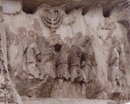Interior del arco de triunfo de Tito donde se observa la procesión con los botines de guerra obtenidos en la guerra contra los judíos y de la conquista de Jerusalén en el año 71 d. C. De derecha a izquierda se puede ver un estandarte donde posiblemente iría el nombre del pueblo vencido, el candelabro de siete brazos, símbolo de pueblo judío, las trompetas de plata y la puerta triunfa. (Foto: Roberto Lérida Lafarga 28/12/2004) |