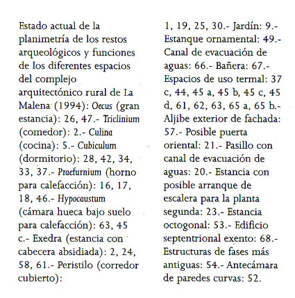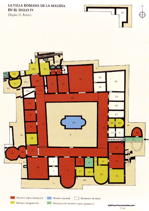 Plano de la Villa de la Malena (Azuara, Zaragoza), según ROYO GUILLÉN, José Ignacio: La Malena (Azuara, Zaragoza). Precedentes y evolución de una villa tardorromana en el valle medio del Ebro, Azuara, 2003 |
