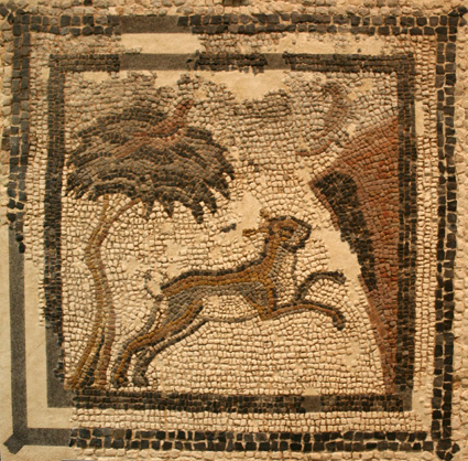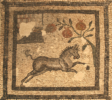 Dos mosaicos del calendario agrícola de la Villa Fortunatus (Fraga, Huesca): el asno y las grandas como símbolos de febrero y la liebre y los pájaros, como símbolos de abril. Museo Provincial de Zaragoza (Foto: Roberto Lérida Lafarga 03/01/2008) |